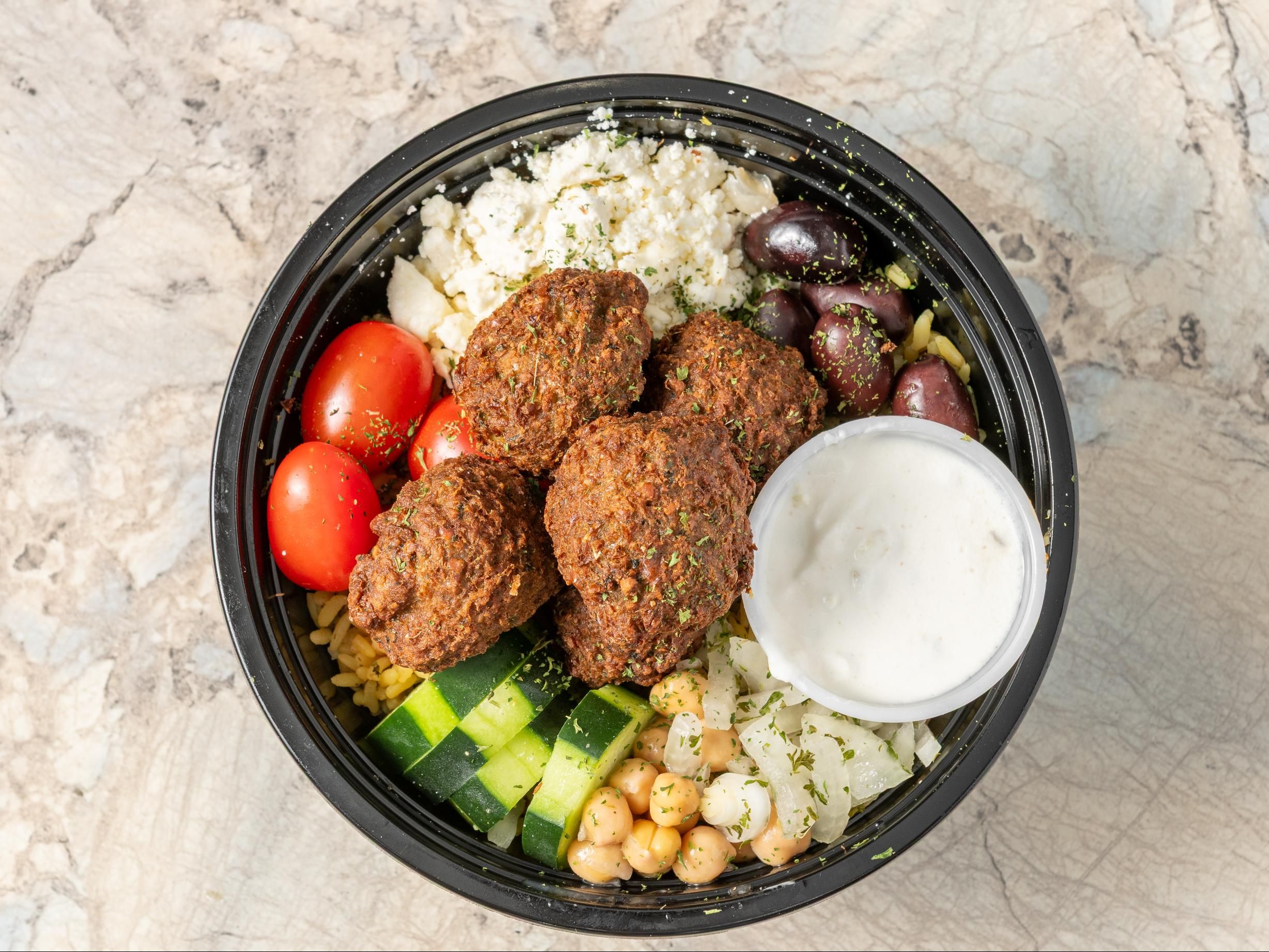 Falafel. rice pilaf, tomatoes, onions, garbanzo beans, kalamata olives, feta & tzatziki.