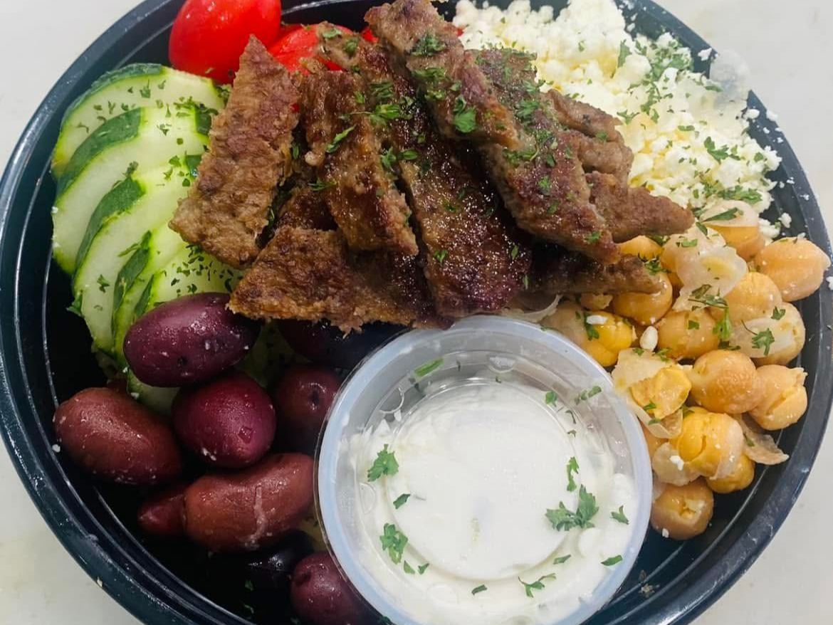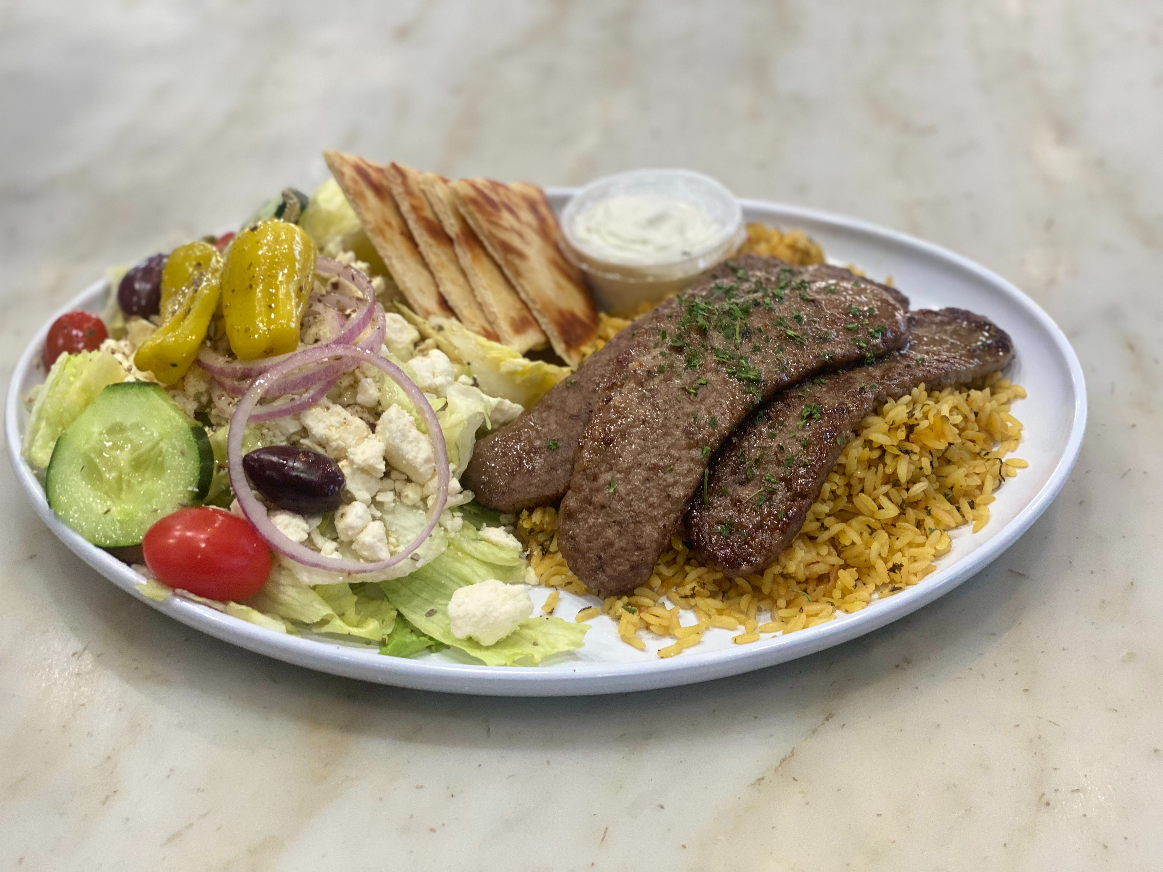 Gyro meat. rice pilaf, tomatoes, onions, garbanzo beans, kalamata olives, feta & tzatziki.