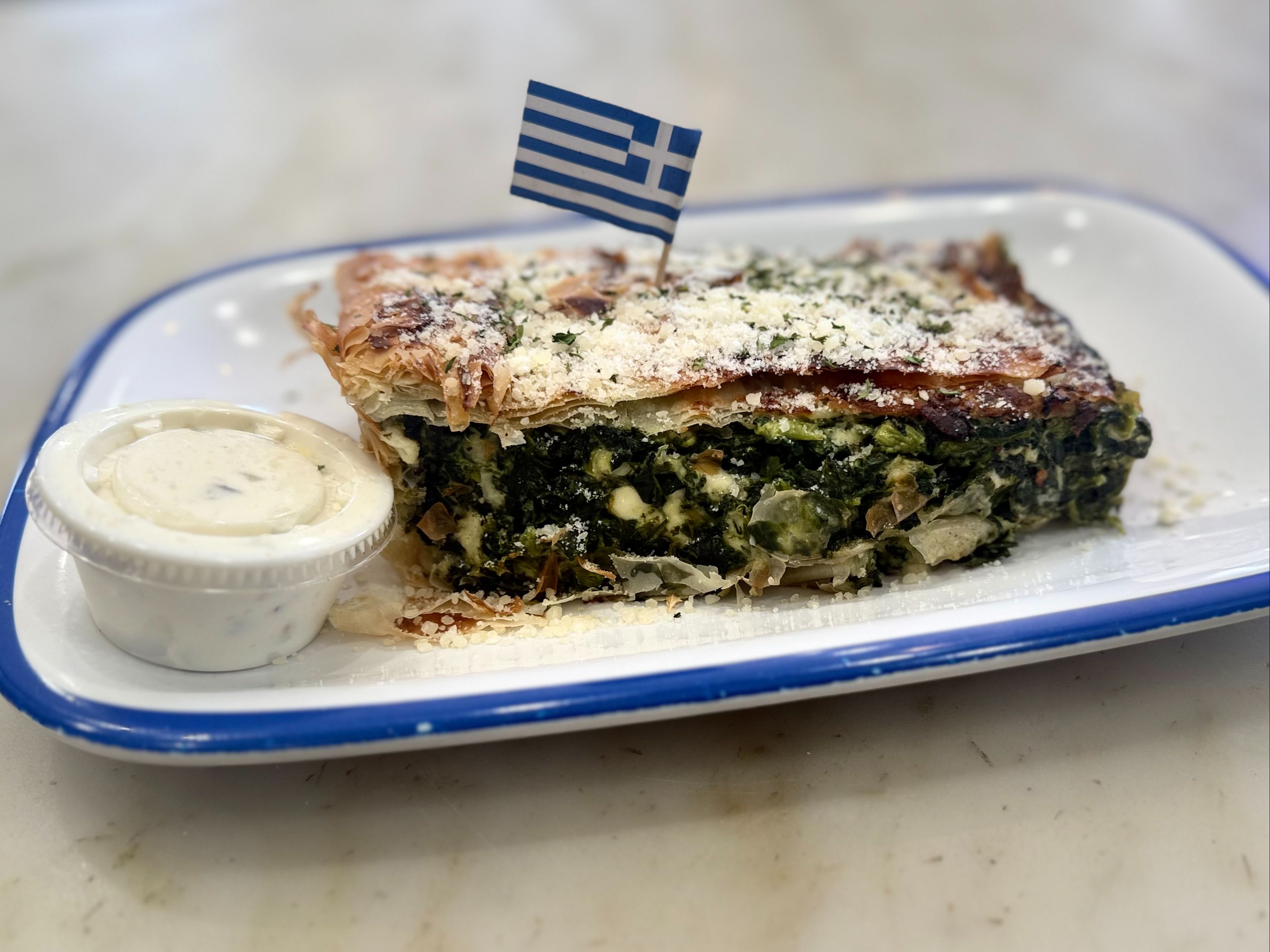 Flaky pastry filled with spinach, feta cheese and spices, topped with parmesan cheese