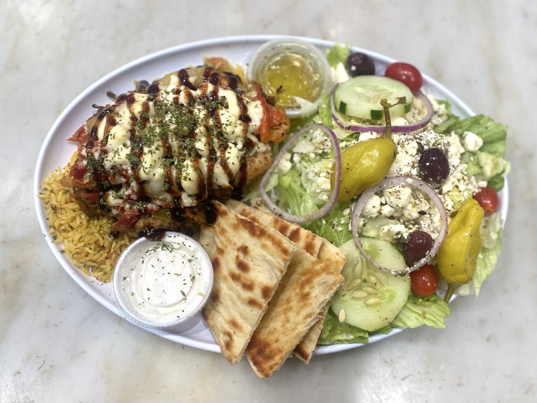 Marinated grilled chicken breast topped with artichokes, sundried tomatoes & feta, drizzled with balsamic glaze. served over rice, with greek salad, pita & tzatziki.
