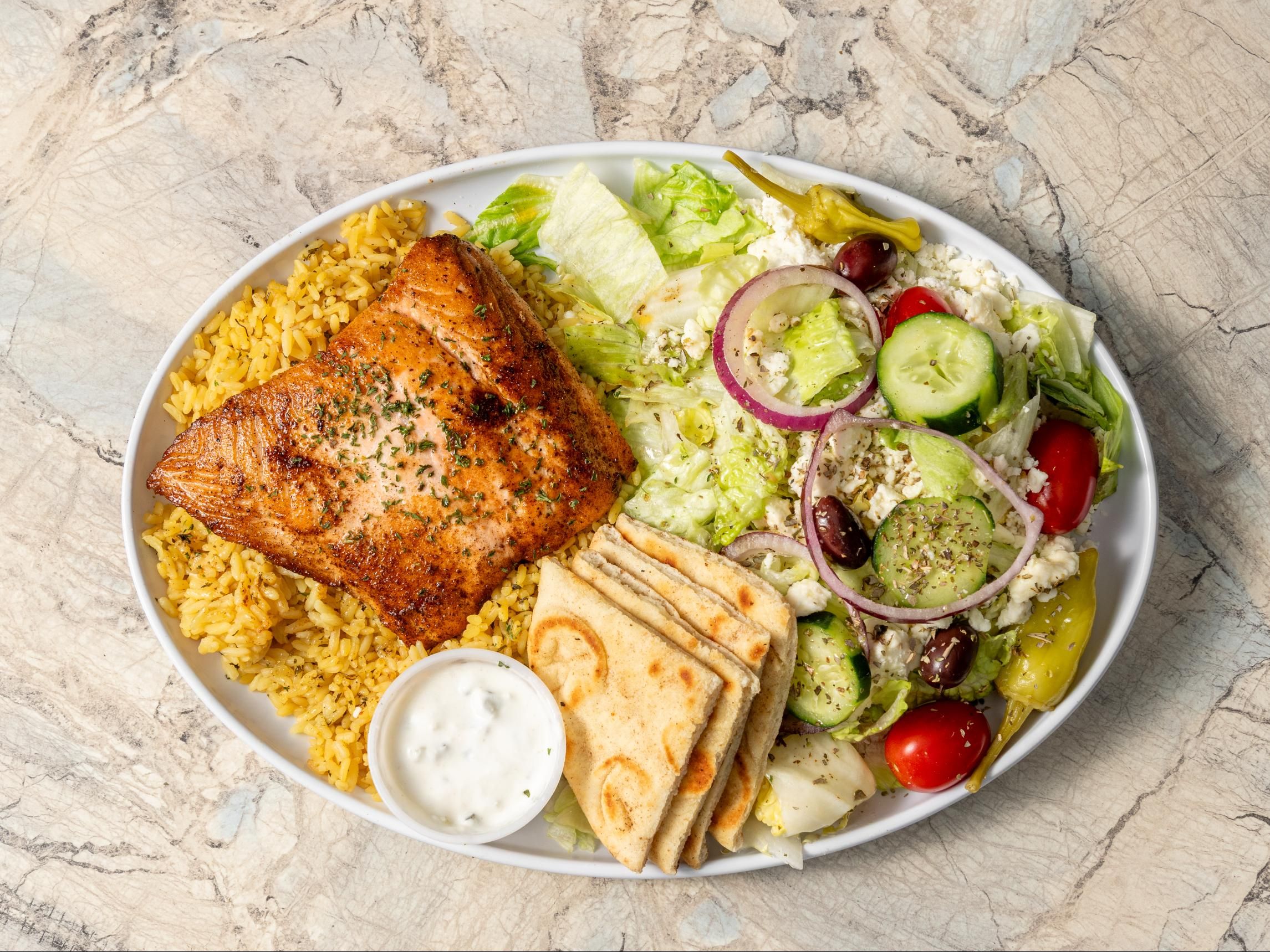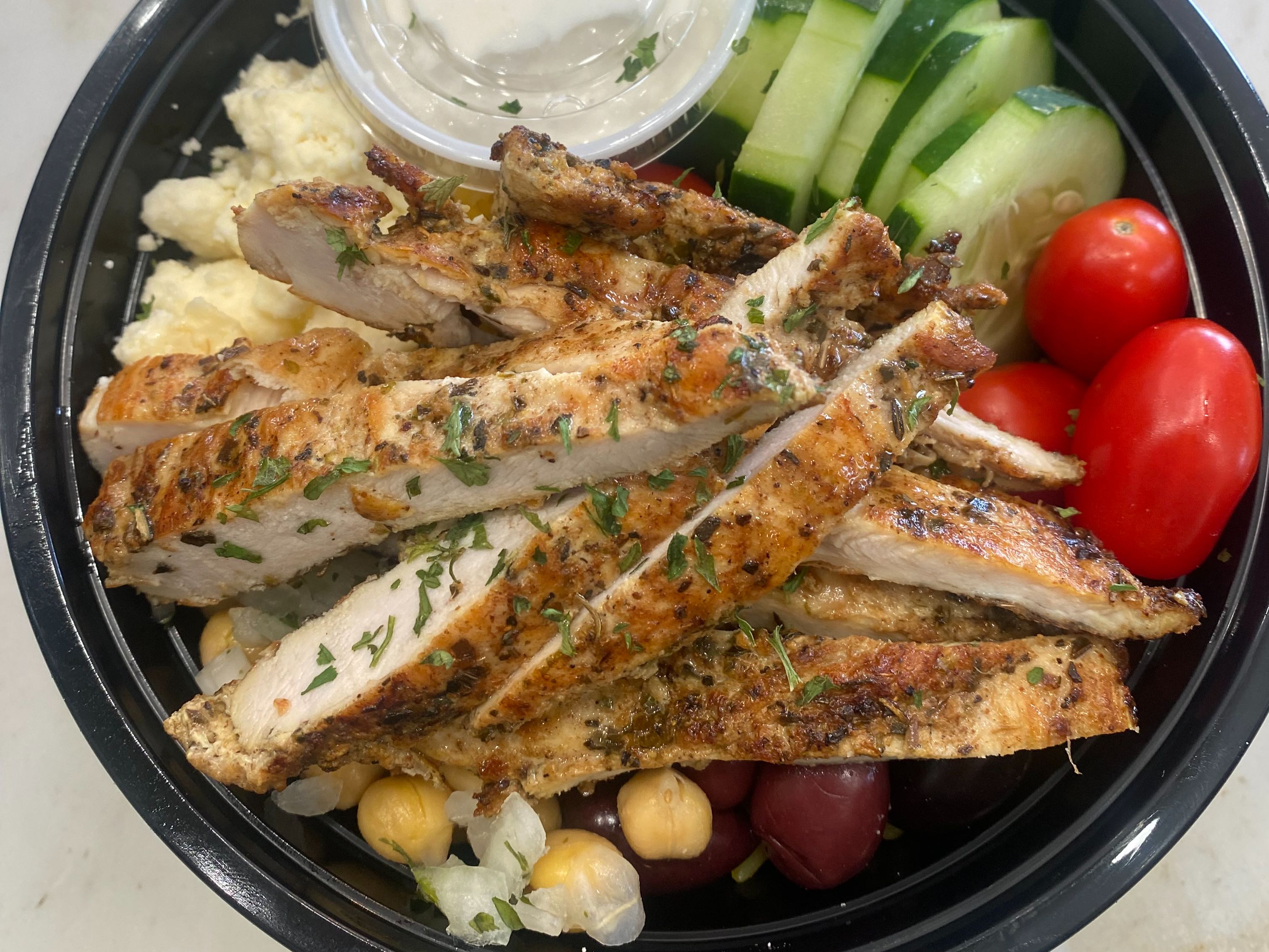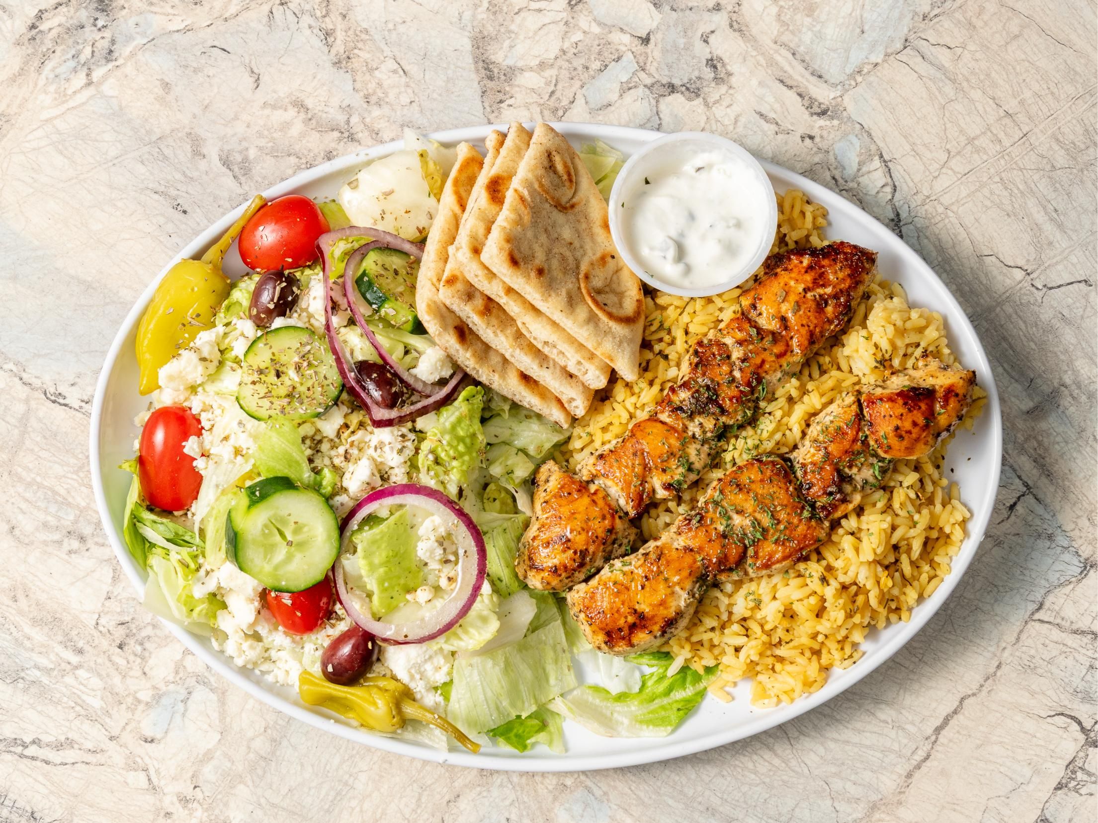 Grilled chicken. rice pilaf, tomatoes, onions, cucumbers, kalamata olives, chickpeas, feta & tzatziki.