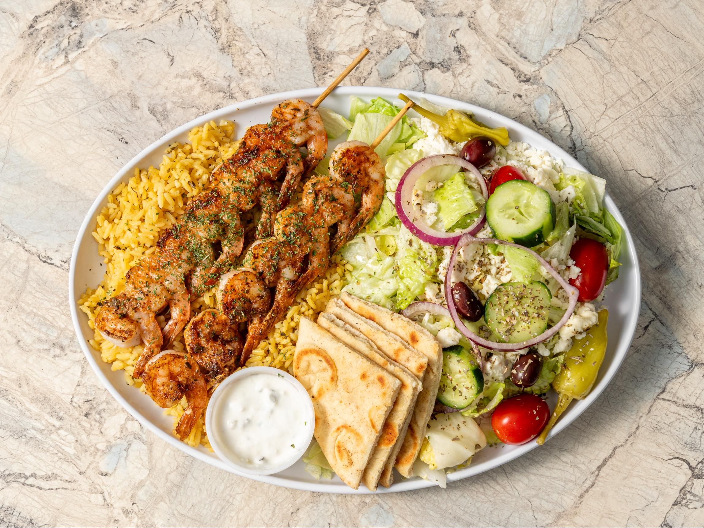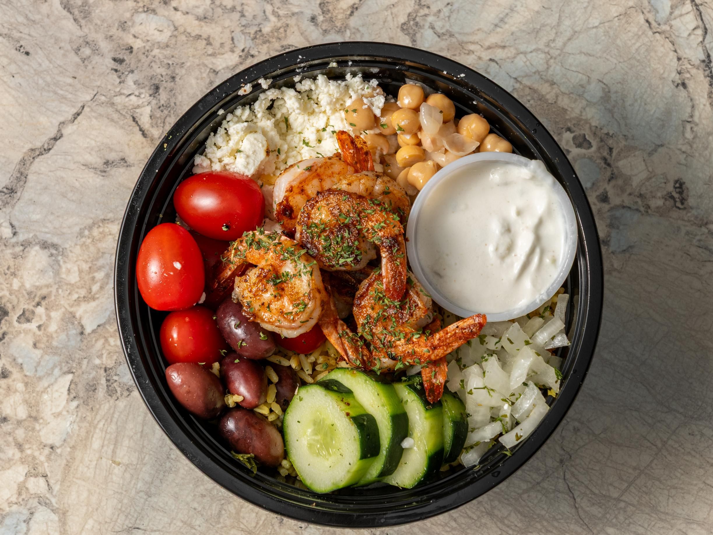 Grilled shrimp. rice pilaf, tomatoes, onions, cucumbers, kalamata olives, chickpeas, feta & tzatziki.