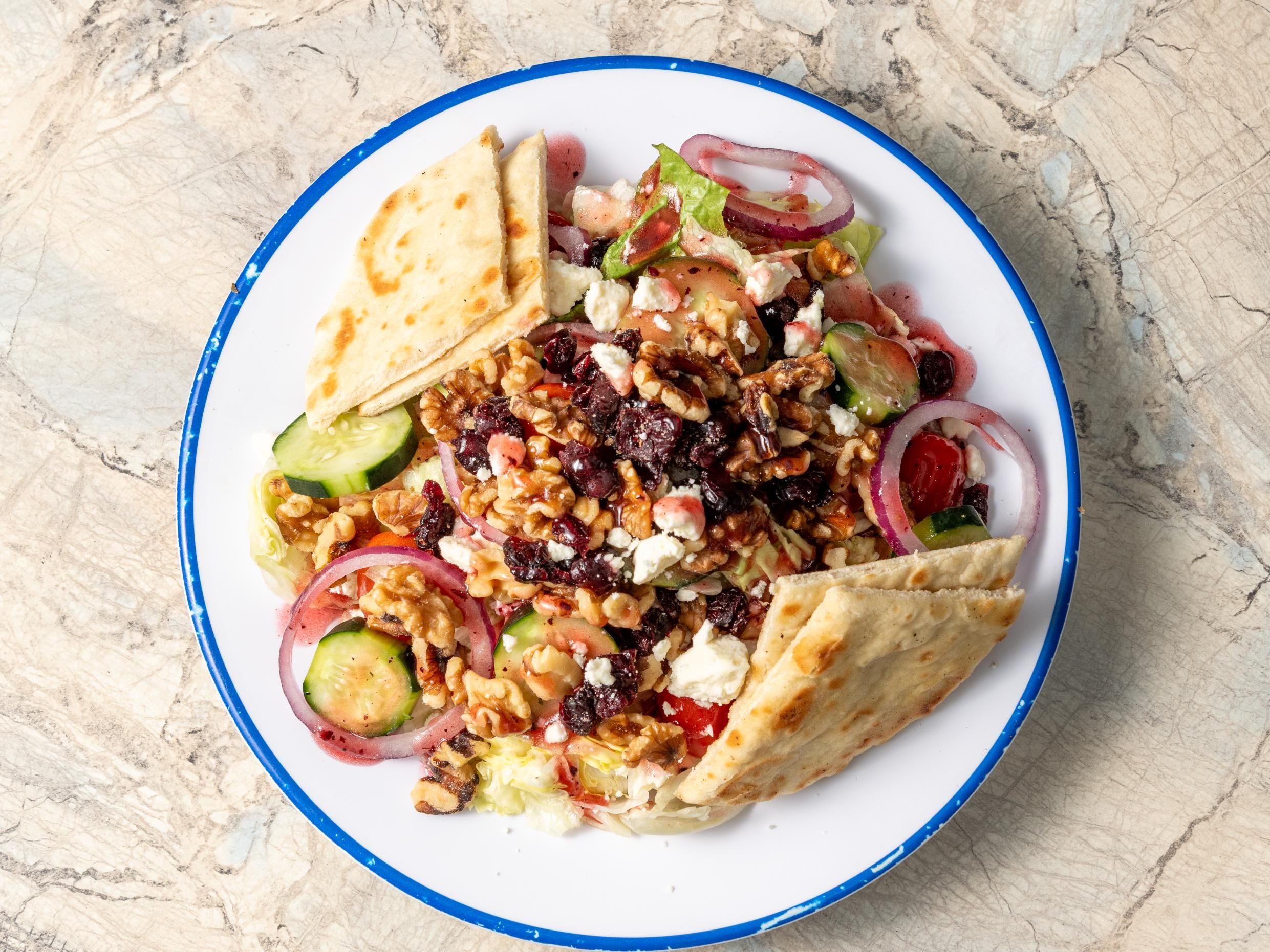Lettuce, tomatoes, onions, cucumber, feta cheese, walnuts & cranberries, with raspberry vinaigrette. served with pita.