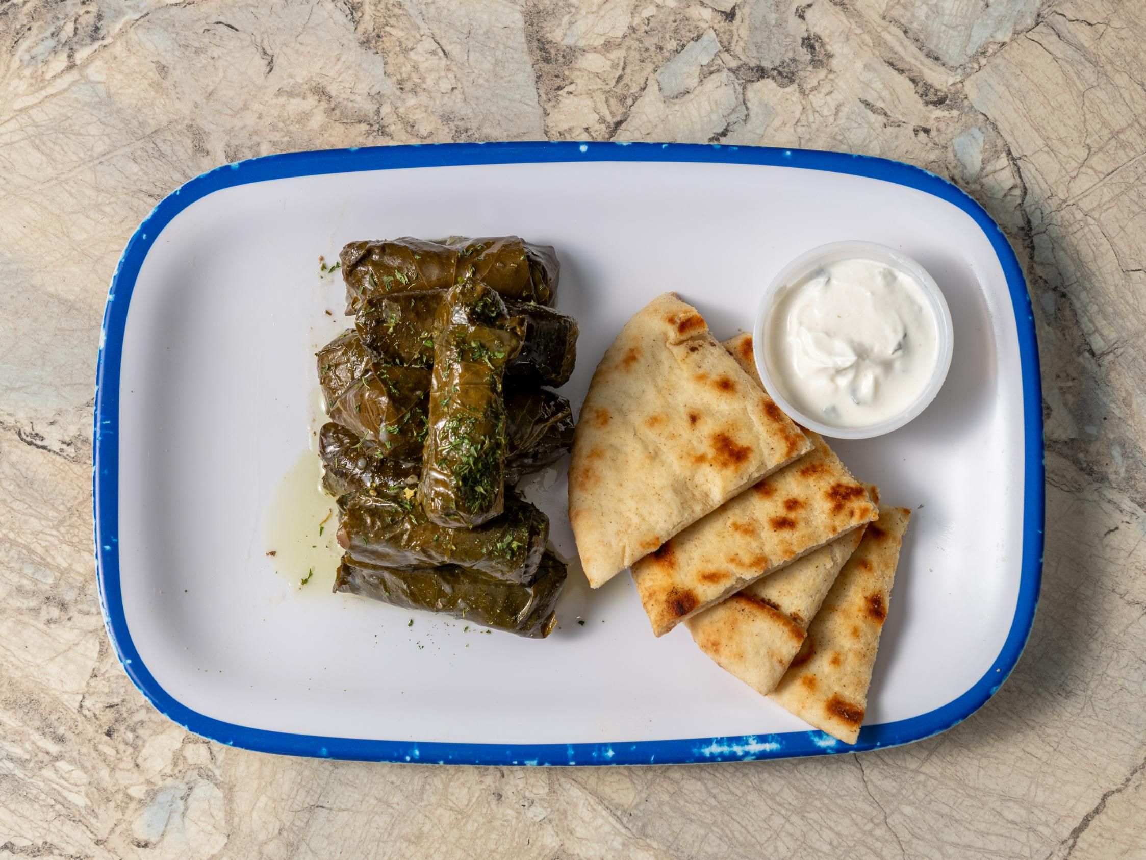 8 hand-rolled grapevine leaves, stuffed with rice and fresh herbs, drizzled with lemon sauce. served with greek salad, pita & tzatziki.